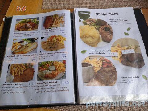 チキンシュニッツェルハムのチーズのせが149バーツ。ポークネックステーキのタイスタイルソース付きが139バーツ。これってポークネックはコームーのことだろう。コームーヤンステーキか。