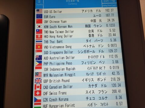 ちなみに、関空の国際線制限エリア内にある両替所のレート。