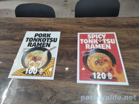 ポークトンコツラーメン100バーツ、スパイシートンコツラーメン120バーツ。