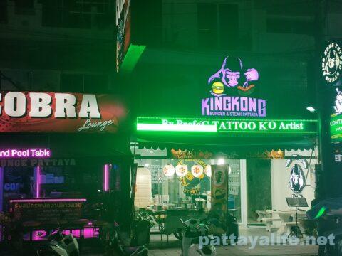 夜間のため、少しわかりづらいが、KINGKONGの看板の下に日本語ののぼりと屋台あり。