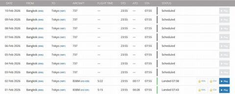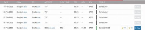 関空発初便は、2月3日午前9時20分に離陸。到着予定はタイ時間の午後1時30分の予定となっている。現在飛行中だ。