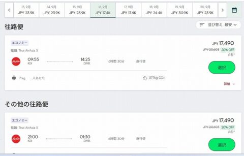 ためしに関空=バンコク路線で調べてみると、片道17,490円で出ている。たしかに20%オフが適用されている。