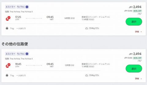 ウドンタニー発成田行きのフライスルーが、なんと、総額2,494円で出ているではないか。