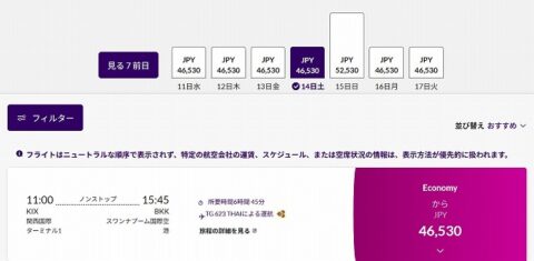 11月の関空発バンコク行きの運賃をチェックしてみると、往路では片道最安値で46,530円となっている。