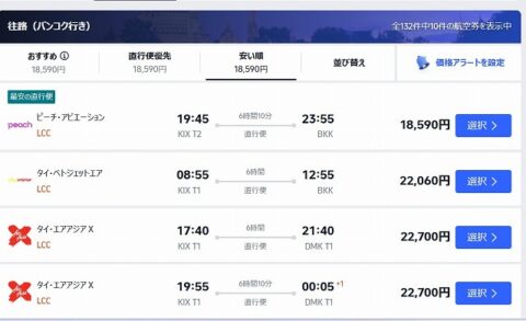 関空からバンコクへの直行便だと、Peach、タイ・エアアジアX、タイ・ベトジェットの3社が就航している。