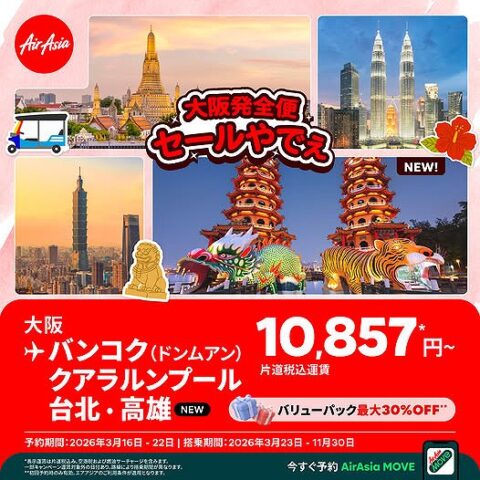 エアアジアが大阪発航空券のセールを開催している。