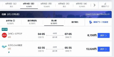 フィリピンとタイを結ぶ路線は意外と運賃が高めだが、片道総額8,000円台はかなりお得。
